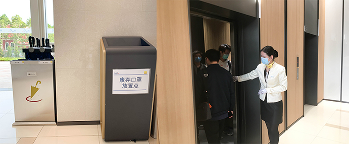 為減少人員接觸,大堂電梯處設(shè)有專(zhuān)人服務(wù),有序指引乘坐電梯